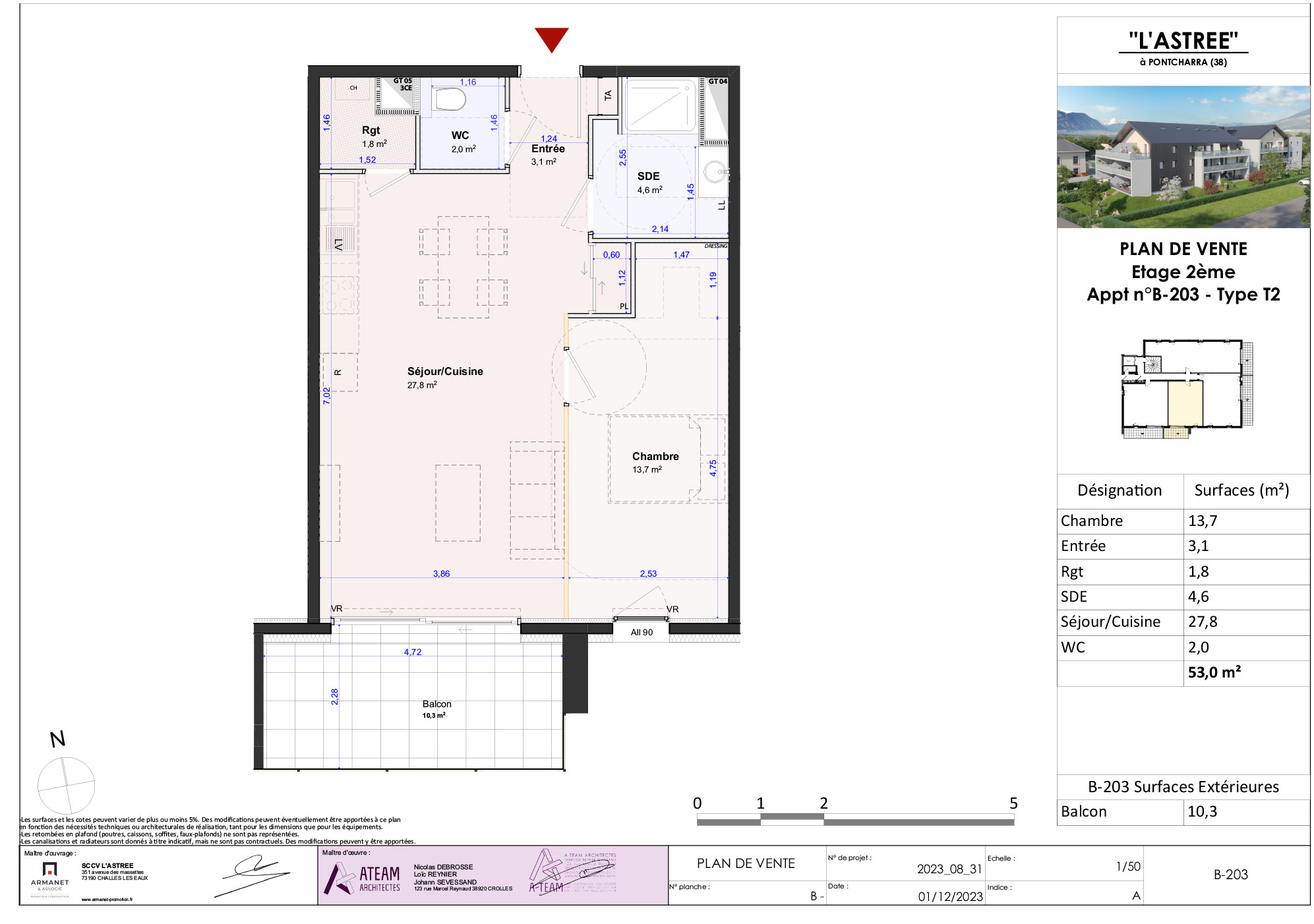 | B103 | 52.80 m² | 9.60 m² | R+1 | Sud | 208 000 € | Plan + d'infos | ||